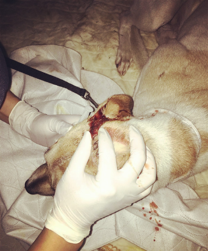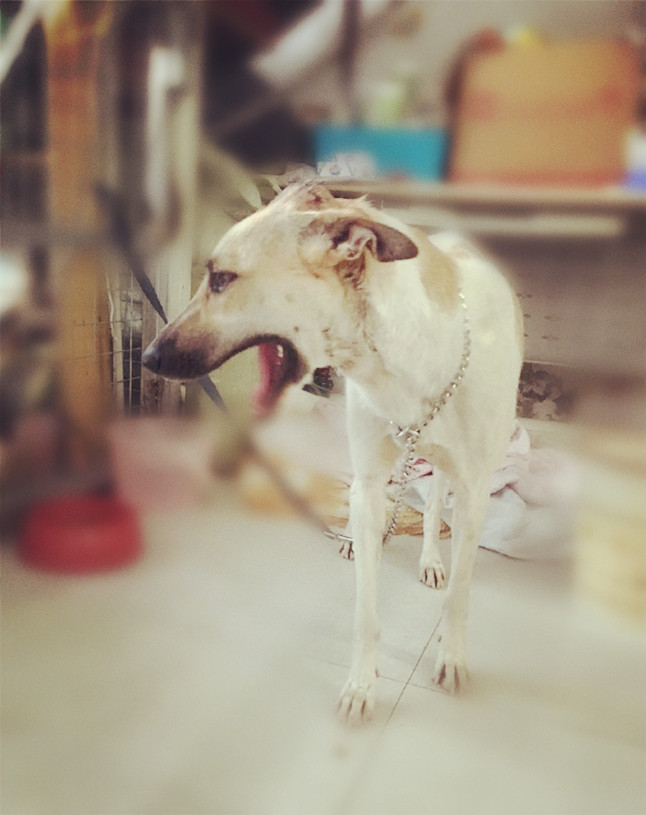 它叫狼外婆,現(xiàn)在是神氣活現(xiàn)的,走進(jìn)一看,頭上的被縫了20針不止吧,義工說是被好心人在刀下救下來的,殺狗的人不太懂,砍歪了,保住了命。