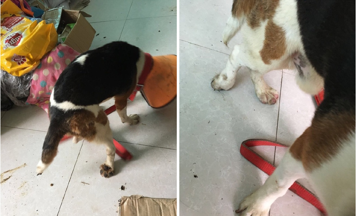 外地送來的比格犬,腰間盤突出,那邊的醫(yī)院要將她安樂死,好心人開車送到了這里,看著它后爪都腫成小饅頭了。平安這里是大理石的地面,它慢慢地拖著腿在地面移動(dòng),不敢想象它在外面流浪的時(shí)候那個(gè)血肉模糊的畫面。
